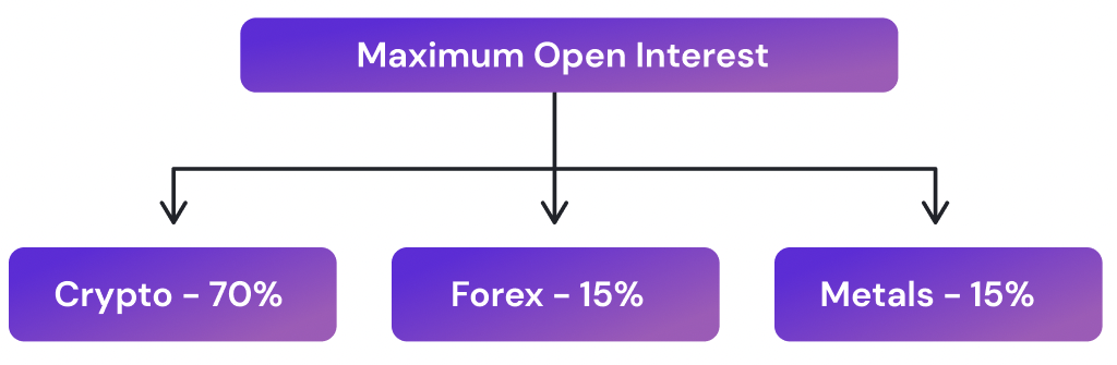 2. Second, we divide up this maximum open interest into its constituent asset classes. In the beginning, we offer crypto, forex and precious metals pairs, but over time, max OI will be shared with more commodities and other exotic asset products (like indices) as well. The OI per asset classes will always add up to 100%. Currently, the OI split looks as follows: